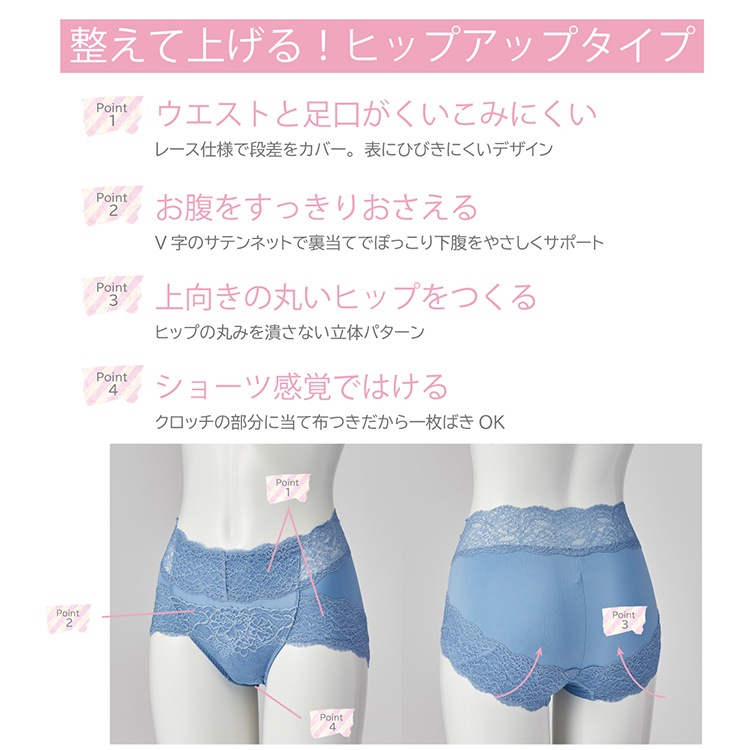 ・整えて上げる!ヒップアップタイプのソフトガードルです。エレガントなストレッチ落下版レースで大人華やかなデザイン。フロントには伸び方向を切り替えた裏打ちをほどこし、お腹をやさしく押さえます。バックはレースに沿った裏打ちとおしりの丸みをつぶさない立体設計でヒップアップを叶えます。ウエストと足口はレースだからアウターにひびきにくいショーツ感覚で履けるデイリーにぴったりの1枚。サイズも豊富、嬉しいS~LL展開です。お揃いのナイトブラとのコーディネイトをお楽しみ下さい。 |