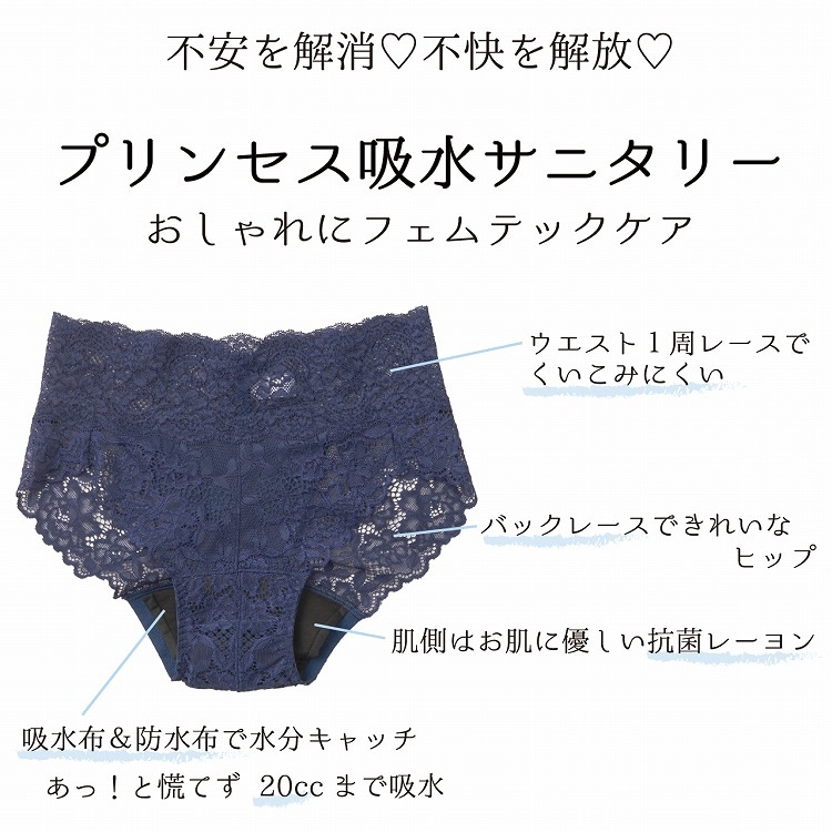 ・フェムテックとは「Female(女性)」と「Technology(技術)」を掛け合わせた造語。女性が快適に過ごせるようにブルーデイからちょい漏れまで対応できる安心の吸水タイプショーツ。ナイトブラとお揃いにできるので寝るときもコーディネートを楽しめます。クロッチ部分…肌側は抗菌加工されたレーヨン生地、下はすばやく吸水する吸水布、その下には漏れをガードする吸水布の3重構造。 |