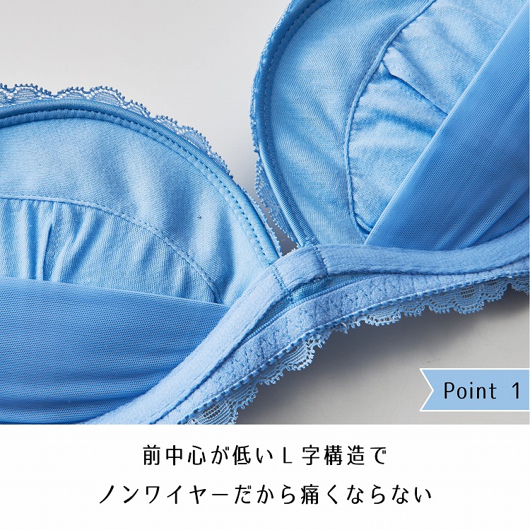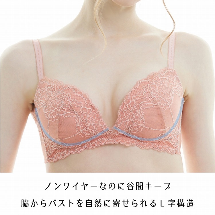 ・心地よく谷間メイク。ヘブンリーフィットシリーズの登場です。はみ肉すっきりの脇高設計だけでなく、ノンワイヤーなのにバストを寄せられるL字構造でキレイな谷間をつくってくれます。 |