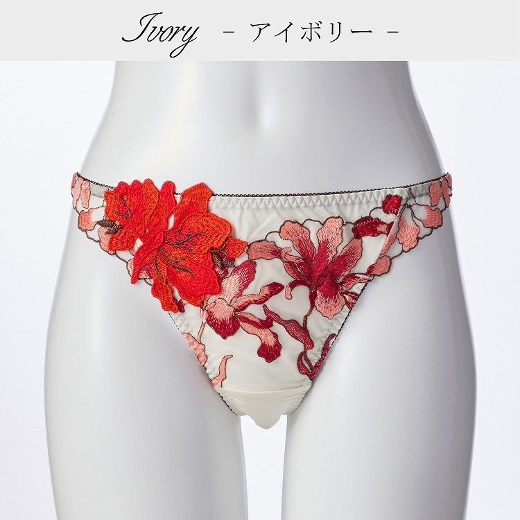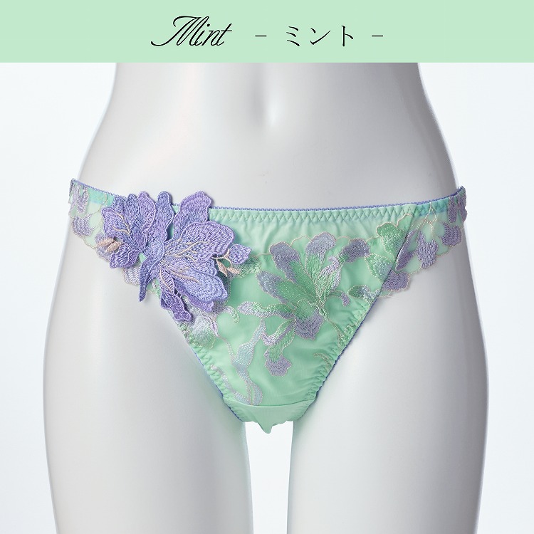 ・2020年9月に発売された大人気シリーズの色替えです。元々一番人気だったアイボリーとブラックに爽やかな雰囲気のミントを追加いたしました。まるで燃え盛る炎のような花姿が特徴のシクラメン。ダイナミックな刺繍と両サイドにつけたアップリケでその特徴を最大限に活かしました。その情熱的な姿と相反するようなシクラメンの花言葉は『内気』、『遠慮』、『憧れ』。セクシーで大胆なランジェリーを身につけても、しとやかなさを忘れない。そんな貴女に贈るランジェリーシリーズです。 |