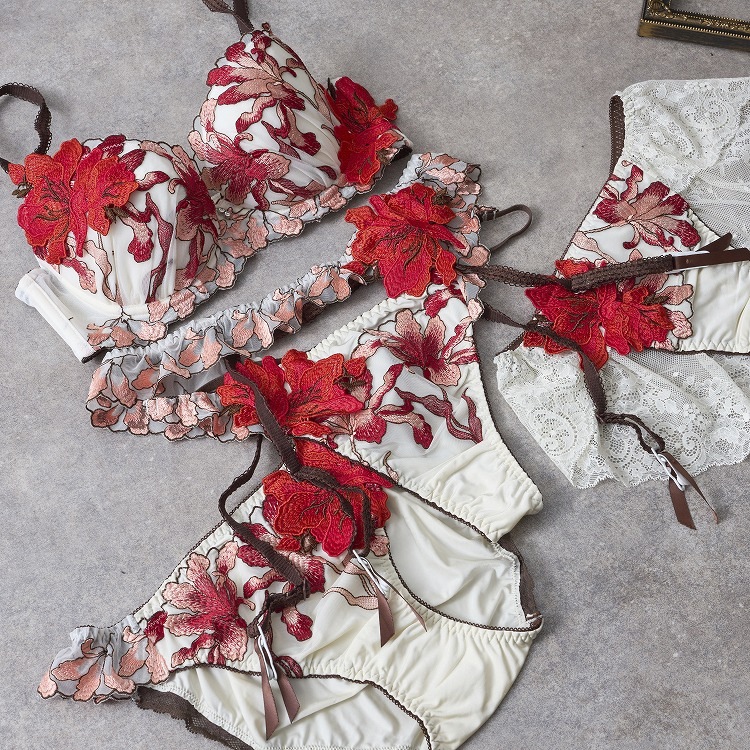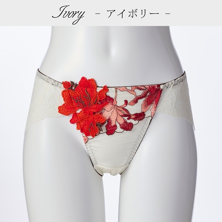・2020年9月に発売された大人気シリーズの色替えです。元々一番人気だったアイボリーとブラックに爽やかな雰囲気のミントを追加いたしました。まるで燃え盛る炎のような花姿が特徴のシクラメン。ダイナミックな刺繍と両サイドにつけたアップリケでその特徴を最大限に活かしました。その情熱的な姿と相反するようなシクラメンの花言葉は『内気』、『遠慮』、『憧れ』。セクシーで大胆なランジェリーを身につけても、しとやかなさを忘れない。そんな貴女に贈るランジェリーシリーズです。 |