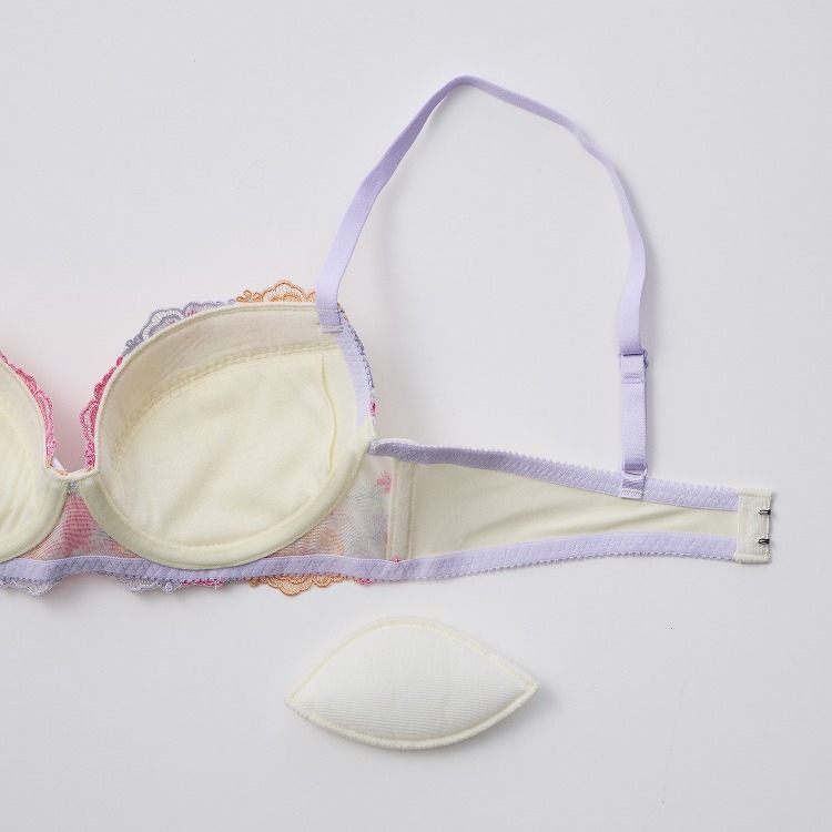 ・パンジーやデイジーなどの、カラフルなお花をたくさんちりばめたかわいらしいブラセット。トロピカルな雰囲気をイメージしたカラフルポップな色合いがとってもキュート身につけているだけで元気になれそう。 ・2列3段階式になっています ・ストラップは付け替え不可 ・パッドはレモン型、取り外し可能なタイプです |