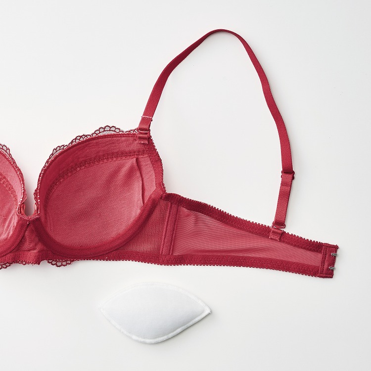 ・チュールに刺繍を施したレースでアーチの中に咲くバラの花。リボンテープを通して可憐さを表現した華やかなデザインです。おそろいのショーツはデイリーにお使いいただきやすいスタンダードタイプ。 ・2列3段階式になっています ・ストラップは付け替え可能 ・パッドはレモン型、取り外し可能なタイプです。 |